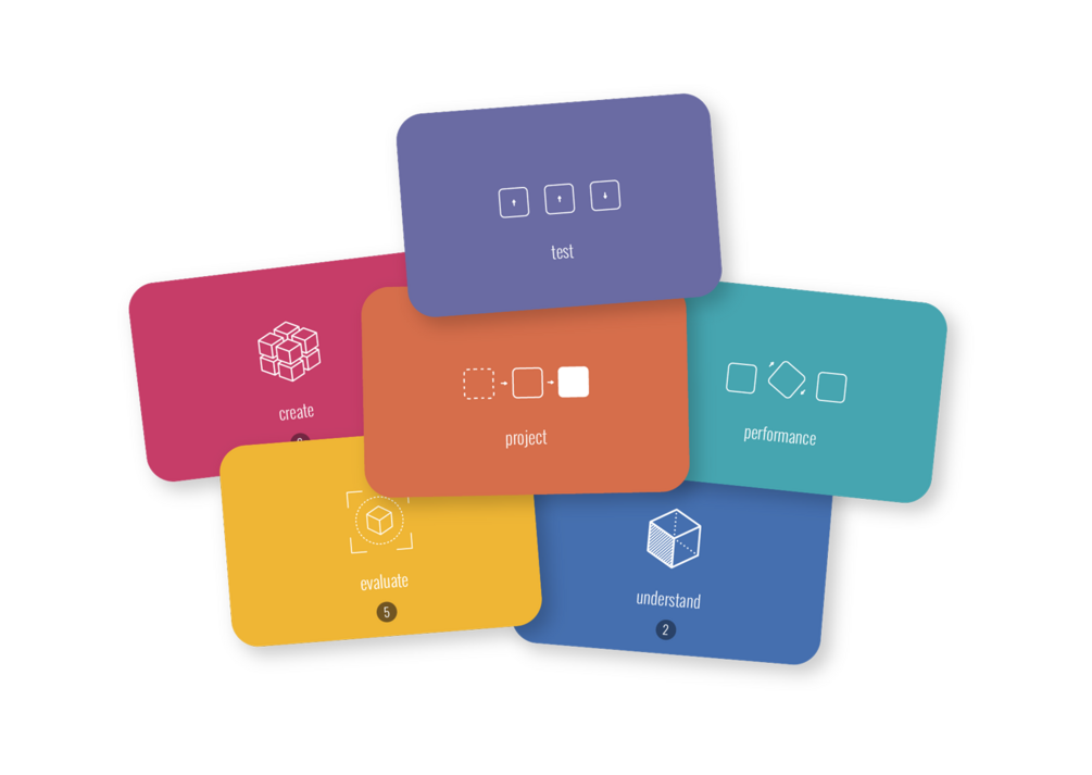 The cognitive dimensions from Blooms’ taxonomy are represented in the deck with verb cards for its six layers of remember, understand, apply, analyze, evaluate and create.