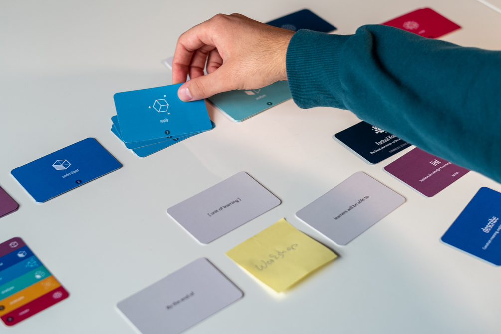 The Learning Assessment Design Deck takes the elements of Bloom’s framework and turns them into a set of modules – the cards – that can be manipulated and composed in a natural and easy way. The modular and interactive nature of the deck makes the process of ideating, constructing and writing learning objectives and constructively aligned assessment mechanisms less abstract and more tangible.