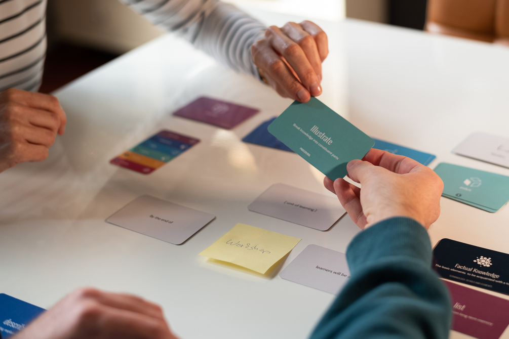 Together with the operator cards, the verb and assessment cards are used to write learning objectives and assessment strategies for any educational context.